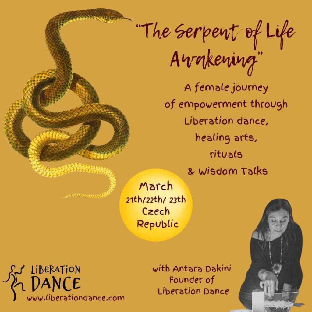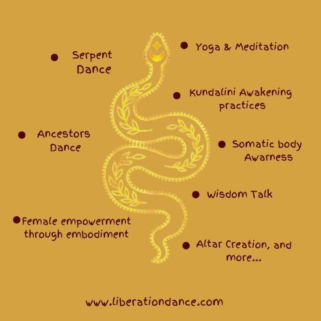 Čeká nás práce s tělem v rámci somatického mapování, hadí “Liberation dance”. Tento tanec pracuje na energetické úrovni a má transformační potenciál. Na programu bude i zpěv, bubnování, tvorba oltáře, jóga, meditace a očistná sauna.